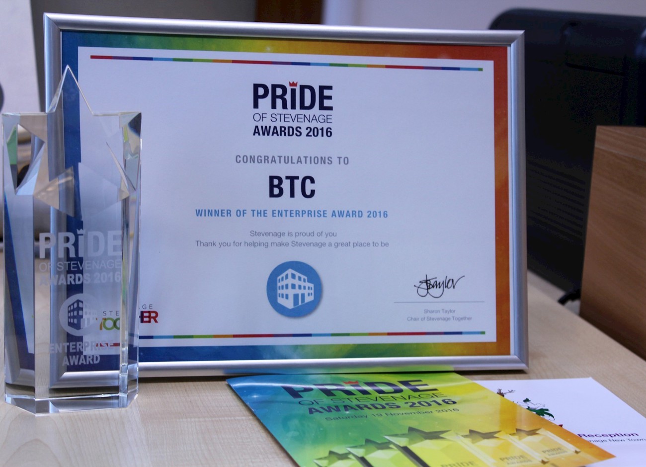 Wenta (btc) is crowned the winner of 'The Enterprise Award' at the Pride of Stevenage Awards 2016 in recognition of the outstanding business support provided to Stevenage residents and businesses.