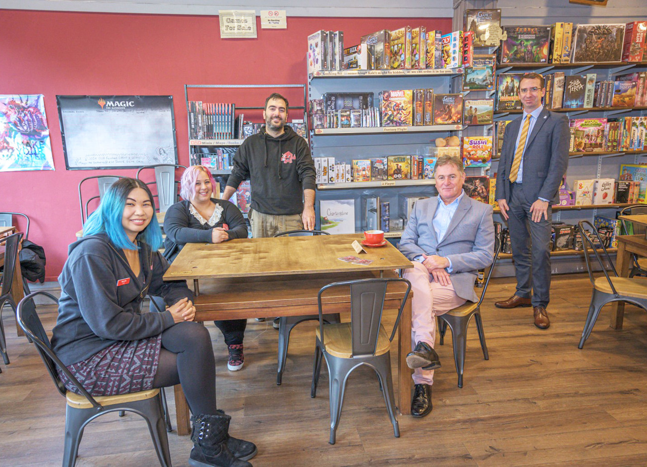 Image shows Watford based business and Wenta clients, the 'D20 Boardgame Cafe' (left), with Wenta's CEO - Ed Jordan and Watford's Mayor - Peter Taylor (right).